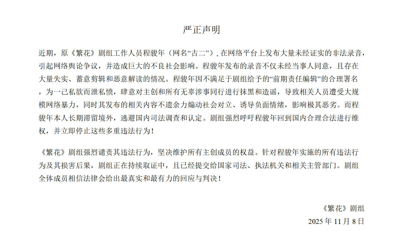 8日,《繁花》剧组方发布严正声明,回应“古二”录音争议,称录音存在大量失实、蓄意剪辑和恶意解读的情况,强烈谴责其违法行为,剧组正在持续取证中。声明表示:“程