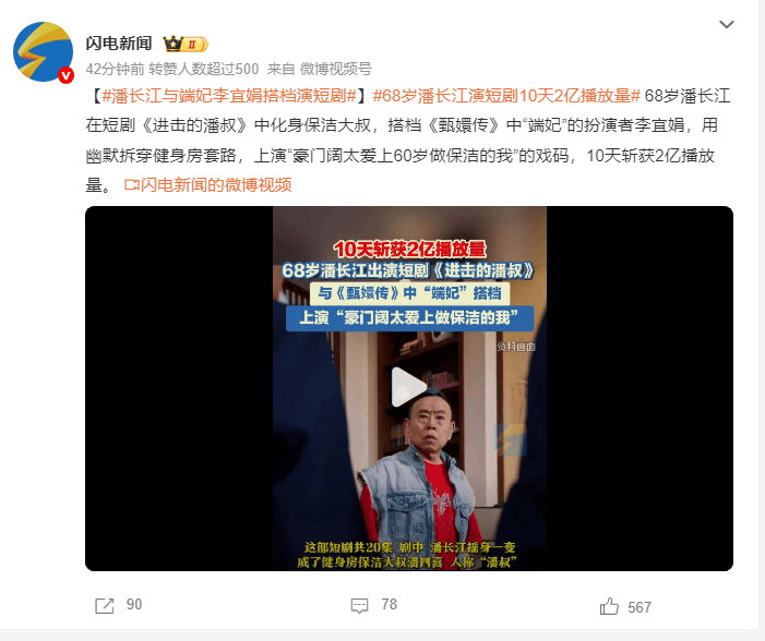 68岁潘长江在短剧《进击的潘叔》中化身保洁大叔,搭档《甄嬛传》中“端妃”的扮演者李宜娟,用幽默拆穿健身房套路,上演“豪门阔太爱上60岁做保洁的我”的戏码,10天斩获2亿播放量。