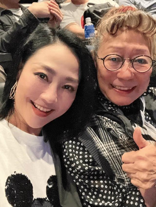 当天的黄文慧一身休闲打扮,金黄色的头发全部扎起来,脸部轮廓更显得圆润。架着黑框圆镜的她脸带微笑露出大白牙,脸色绯红有光泽,虽然肉眼可见岁月的痕迹,但状态依然精神抖擞,更竖起大拇指与杨玉梅合照,看上去心情极佳。
