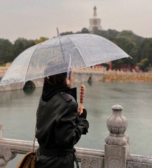 立冬刚过,北京北海公园下起了小雨,本来挺普通的一天,结果有人拍到巩俐了!