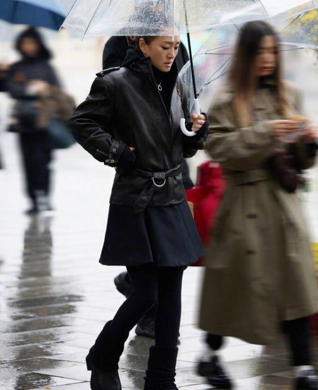 黑色皮衣代表酷飒,透明雨伞又增加了点文艺感,两种风格混搭在一起,既有气场又不失温柔。