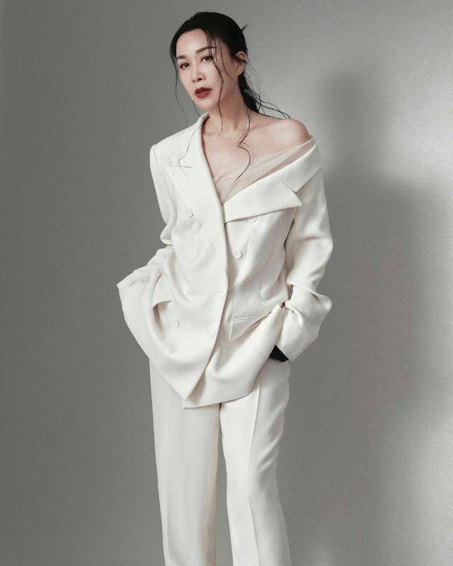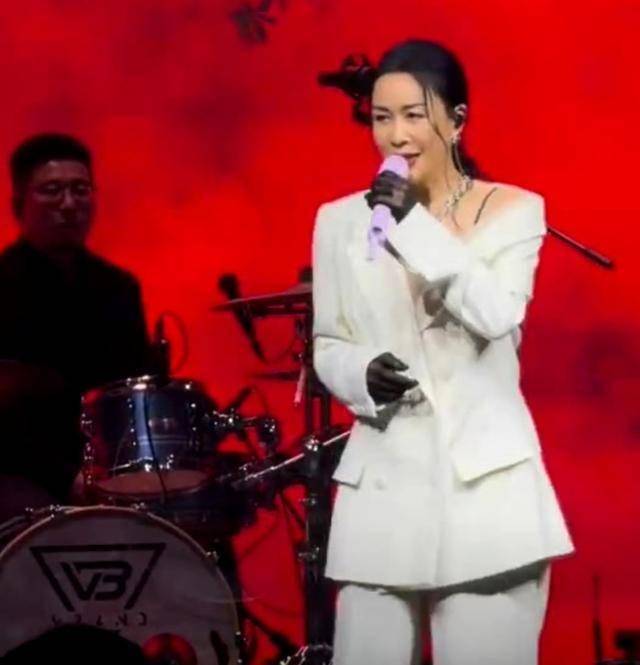 那英搭配的是一套白色的西服套装,这套西服套装很有自己的小巧思,领口处采用了露肩露锁骨的设计,然后再叠加了一些薄纱的元素。