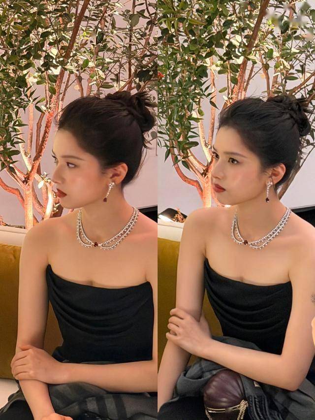 黑色裙子配上珠宝,然后将头发盘起来,整一个人看起来非常的珠圆玉润。