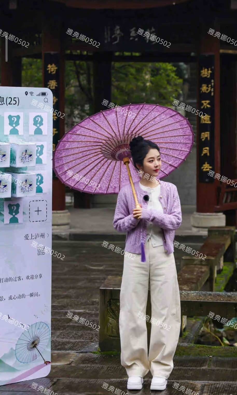 谭松韵近日现身家乡泸州,在忠山公园参与综艺节目《爱上一座城》的录制。当天,她穿着一件香芋紫色的毛衣,梳着丸子头,手持一把粉紫色油纸伞,整体造型既温柔又动人。今年,谭松韵几