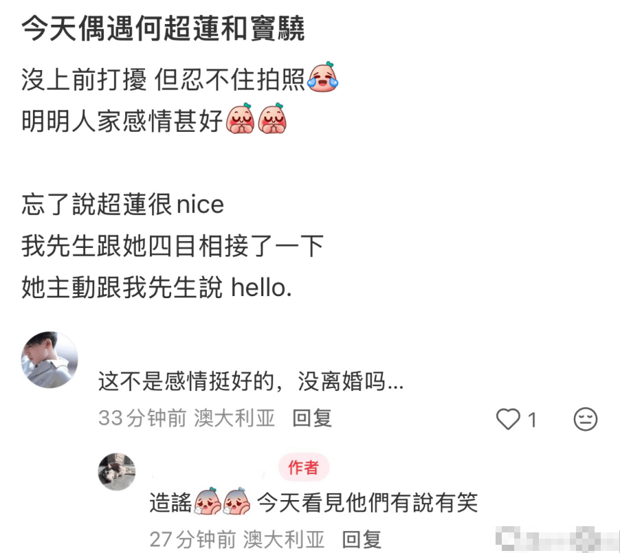 该网友还表示自己偶遇何超莲和窦骁的时候,看见他们有说有笑,感情很好,并称何超莲、窦骁被传离婚的消息是造谣。