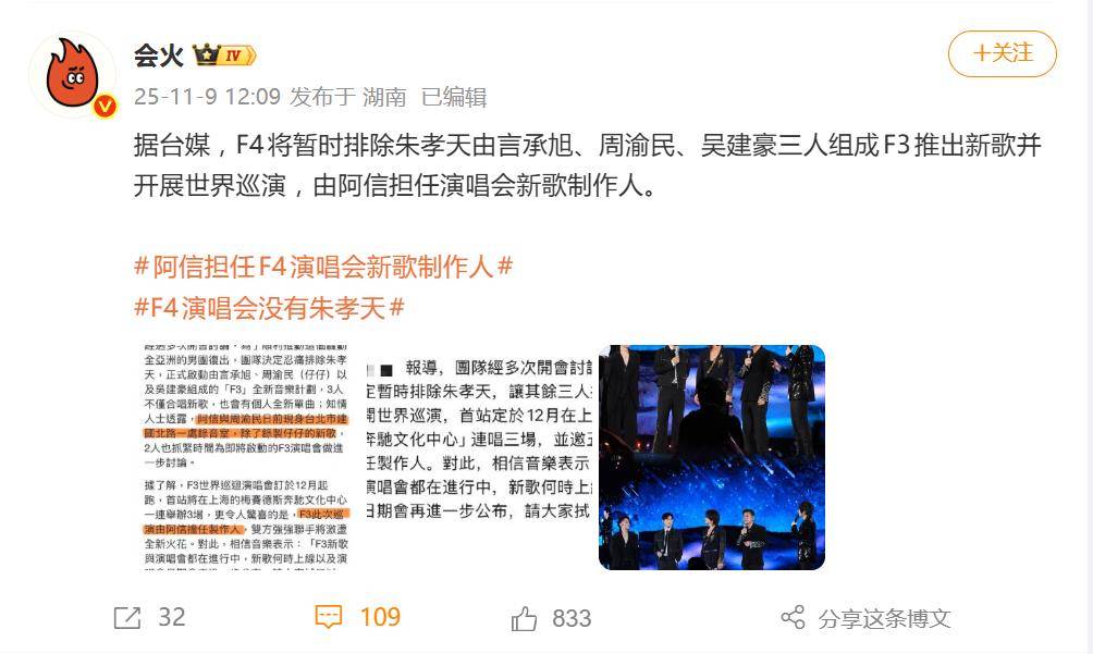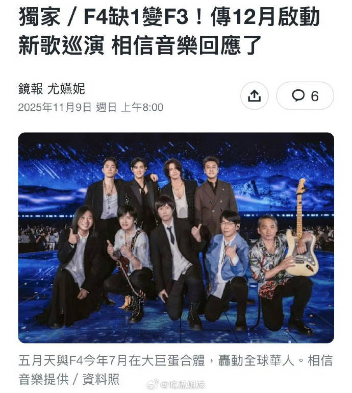 演出首站定于2025年12月,在上海梅赛德斯奔驰文化中心连开三场,后续世界巡演也在筹备中。对此,团队方“相信音乐”已低调证实:“F3新歌与演唱会都在进行中,详情将后续公布”。