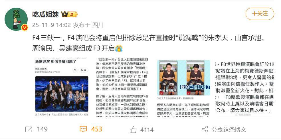 消息一出,粉丝圈瞬间分裂。支持派直言“三人组更清爽”,期待阿信制作的新作,并狠批朱孝天“直播拆台,缺乏契约精神”;而遗憾派则痛心疾首,认为“F4缺一不可,少一个人就不再是青春里的那个F4”。更有网友翻出旧账:朱孝天早年曾称与成员“不熟”,还删过联系方式,如今看来,仿佛一语成谶。