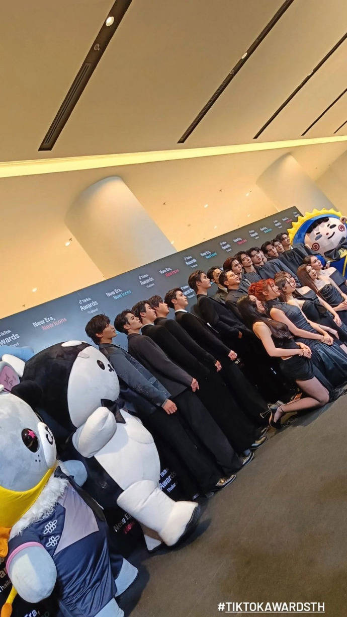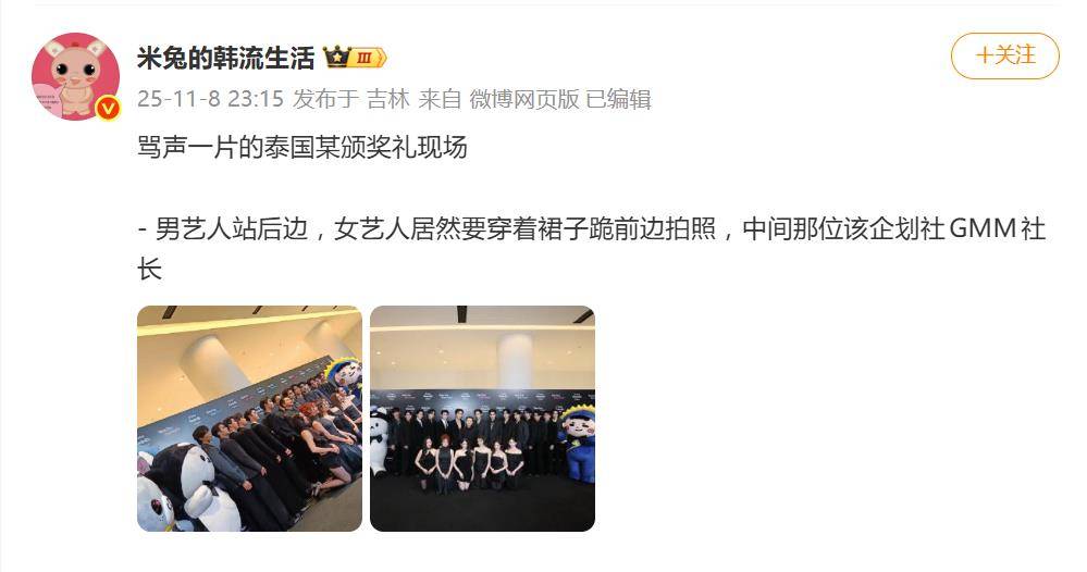 据11月9日网友爆料,一则关于泰国颁奖礼的现场照片,近日在社交媒体上引发争议。在11月8日举办的泰国GMMTV颁奖礼合影环节,出现了一幅被批为“性别双标”的画面:女艺人统一身着短裙和高跟鞋,跪在第一排的硬质地面上,而男艺人与公司社长则安然站立在后排。