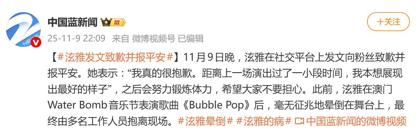“我真的很抱歉。”——11月9日晚,韩国歌手泫雅在社交平台上的这句道歉,瞬间冲上了热搜。原来,就在当天于中国澳门举办的WaterBomb音乐节上,她在激情唱跳完代表作《Bubble Pop》后,竟毫无征兆地晕倒在舞台,最终被工作人员紧急抱离现场。