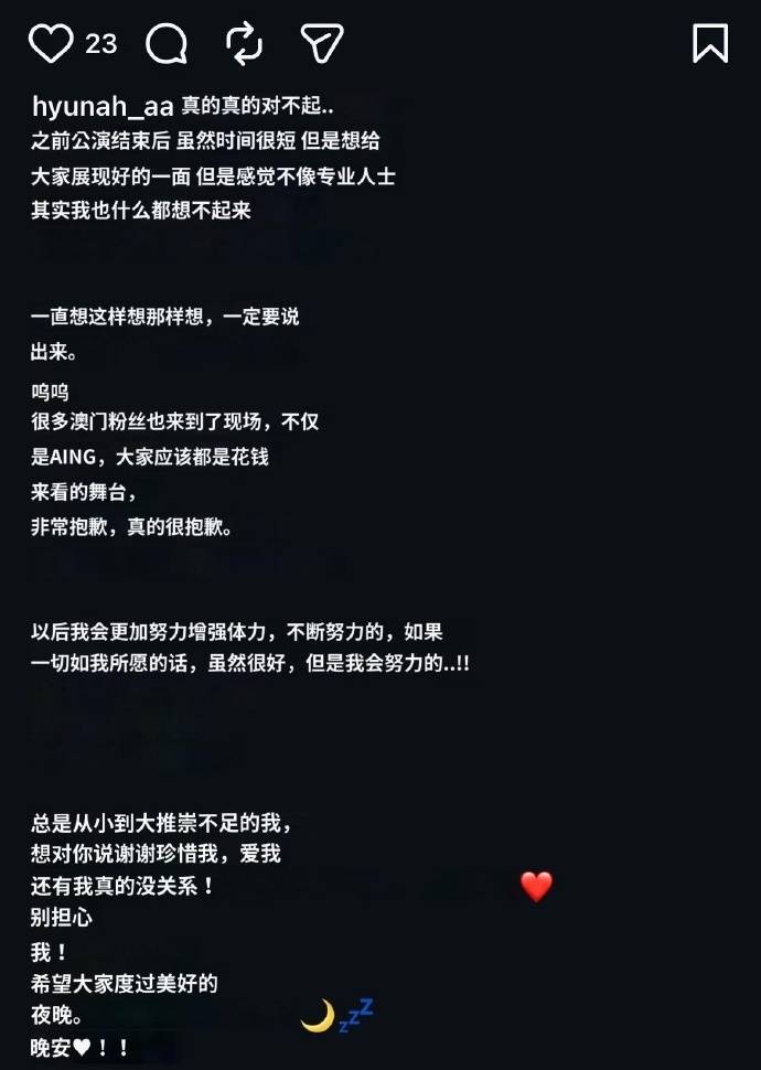 这突如其来的一幕让全网揪心。当晚,泫雅在Ins发布长文,多次强调“真的真的很抱歉”。她坦言,本想为久未看到的粉丝展现最佳状态,却因意外晕倒导致演出中断,为此深深自责,甚至觉得“不够专业”。她特别对澳门的粉丝感到愧疚,觉得大家花了钱却没能看到完整的表演。