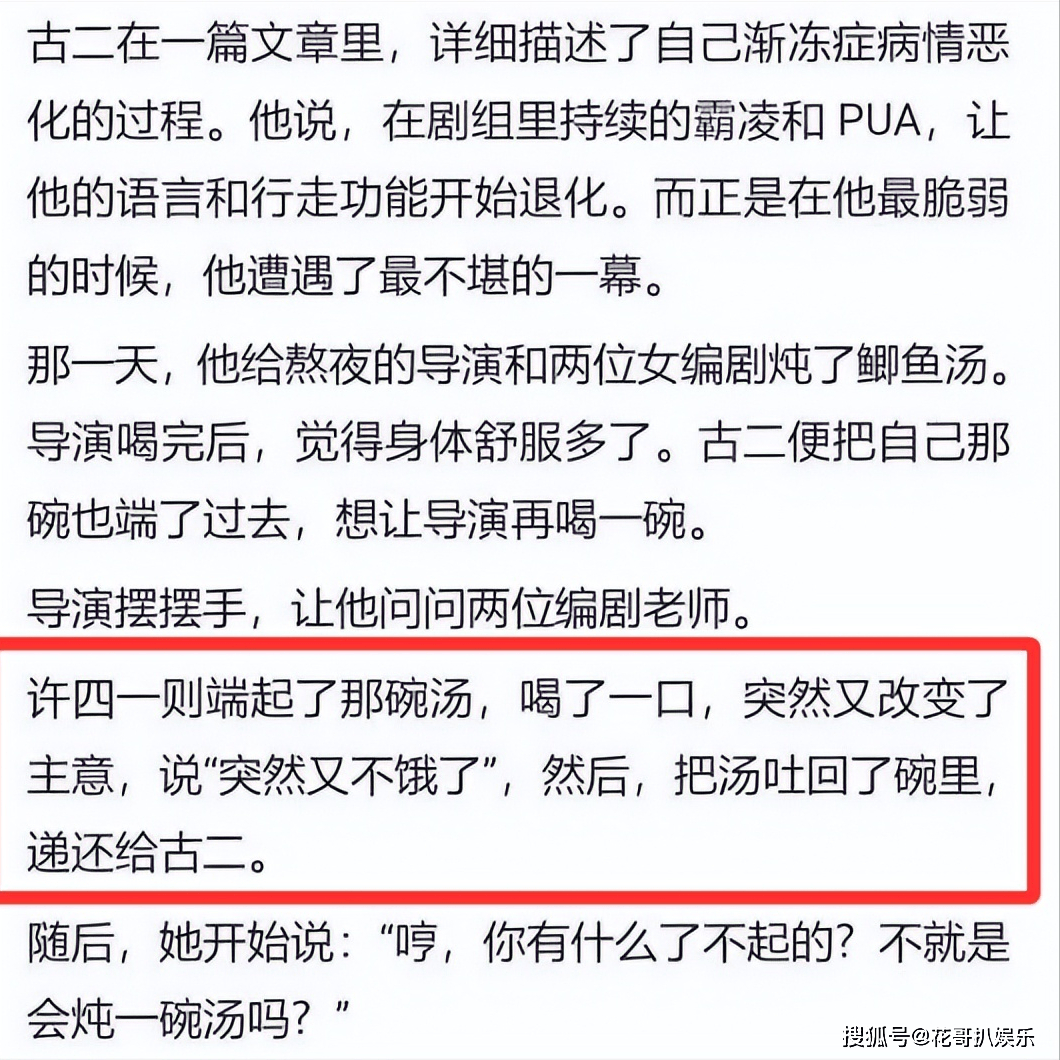 古二强撑病躯换来的劳动成果却被枪手许某窃取,她不仅拿走古二的剧本,还找准机会羞辱古二,某次许某直接在古二的汤里吐了一口口水,再若无其事地端给他喝。当古二被彻底激怒,警告他们不要欺人太甚时,许某不仅毫无悔意,还嚣张地反怼 “有本事死一个给我看看”,其嚣张跋扈的姿态令人发指。
