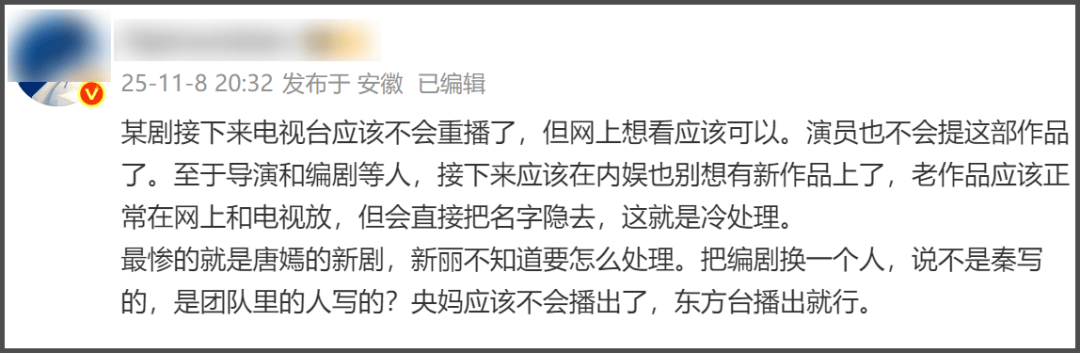 更惨的是,唐嫣的待播剧《爱情没有神话(独身女人)》还是秦雯编剧,此前已经经历一次央视撤档风波,如今被爆料这部剧正式被央视退货了,2025年不再排播。