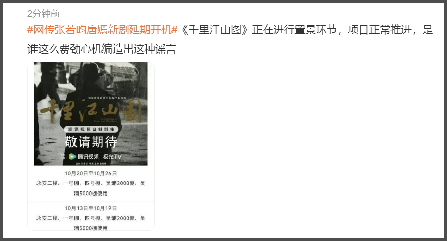 网传唐嫣和张若昀合作的《千里江山图》也延迟开机了,不知道是否也是受此事影响,但也有网友爆料该剧已经开始置景,项目正常推进,但要进组估计也得等一阵儿了。