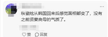 也有网友表示:“秋瓷炫从韩国回来后感觉面相都变了,没有之前贤妻良母的气质了。”
