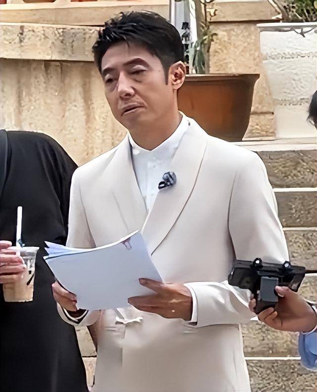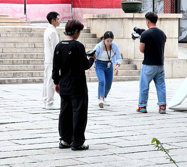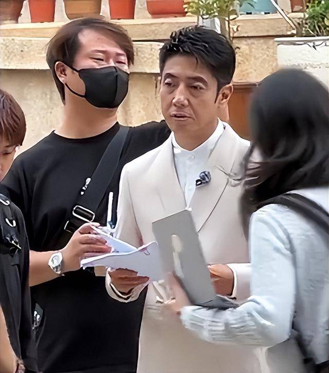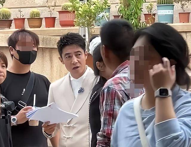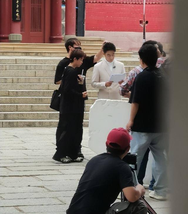 画面中撒贝宁穿着白色新中式西装,发型也梳的很精致,与身边穿着随便的工作人员形成鲜明对比。