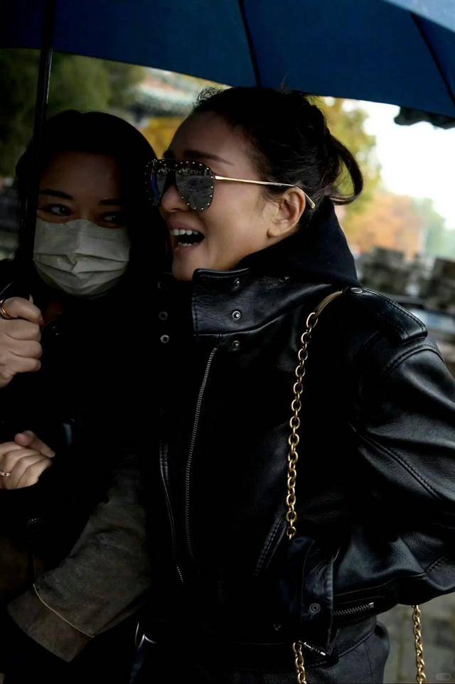 照片中,巩俐身穿黑色皮衣,撑一把透明雨伞,在雨中散步。