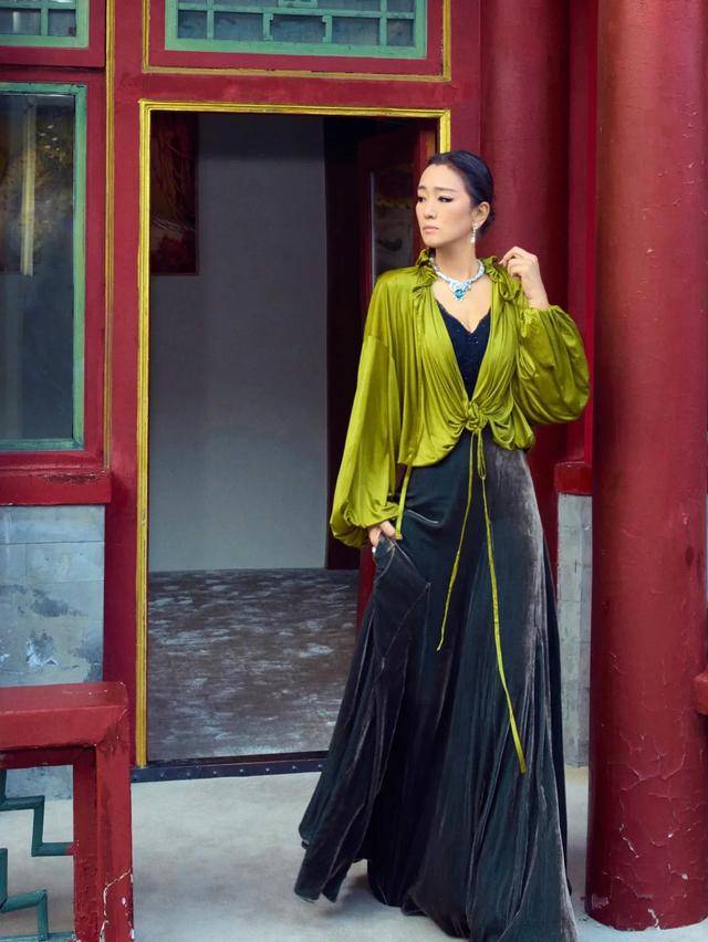 巩俐一身墨绿色长裙,外搭草绿色丝绸衬衫,头发简单盘起,整体简约优雅。