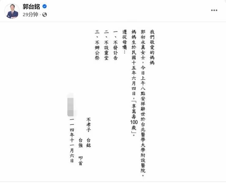 母亲初永真在11月6日安详离世,享年100岁。算起来郭台铭母亲也是喜丧,她的后事一切从简、不设公祭、不设灵堂。