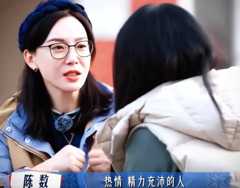 镜头下的陈数穿着牛仔衣,戴着牛仔蓝的发箍,还有文艺的眼镜,这个状态很年轻、看起来一点都不显老。
