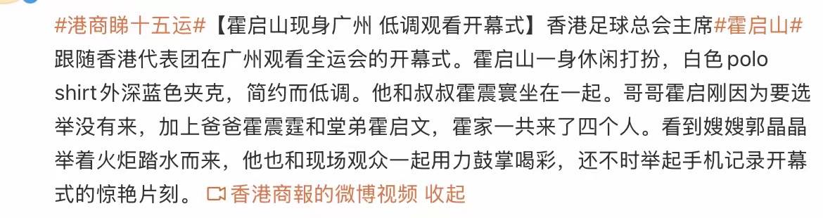 就连之前传递火炬的时候,也是香港、澳门同步进行。甚至有不少名流、政商都参与其中。广州举办的开幕式,自然也吸引了不少观众前往,要说最具代表性的还是霍震霆一家。