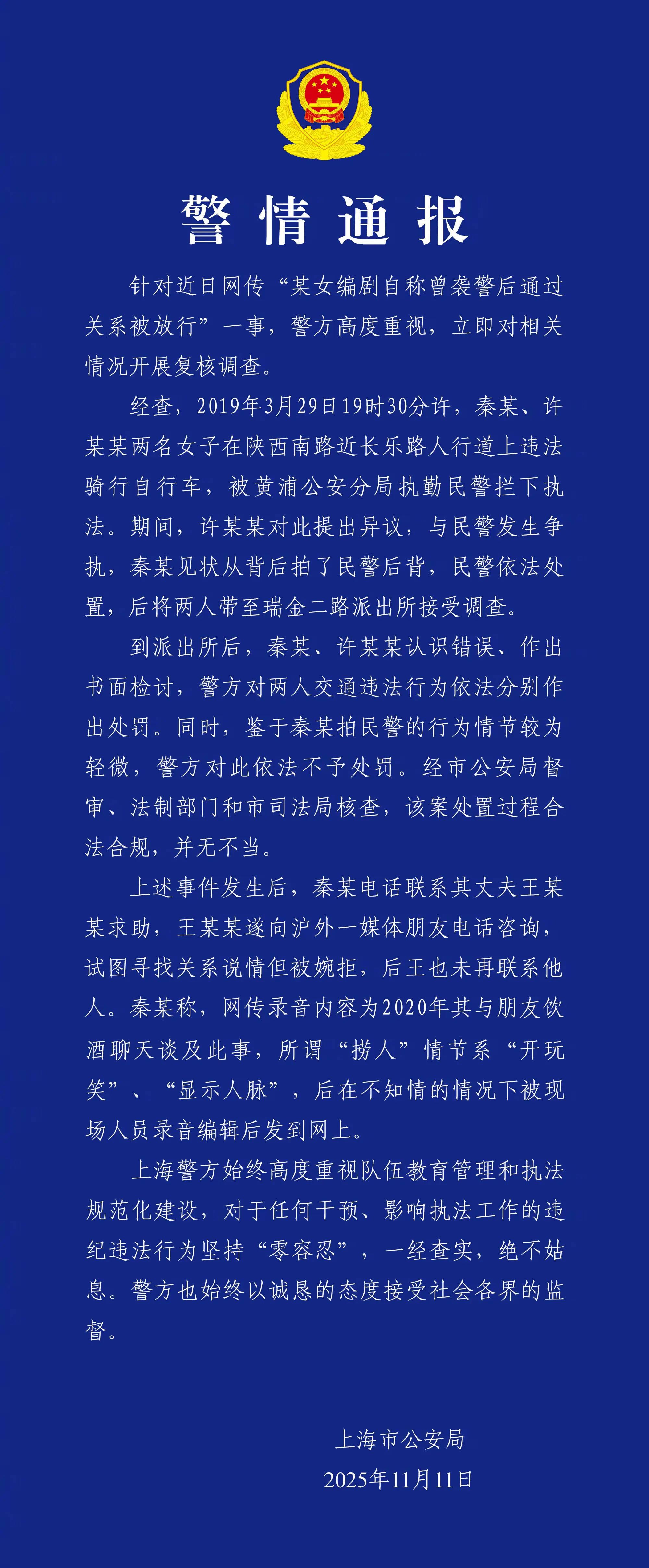 2025年11月11日,针对编剧秦雯自称曾袭警后通过关系被放行一事,上海警方发布警情通报。通报称秦某、许某某被带到派出所后认识错误、作出书面检讨,警方对两人交通违法行为依法