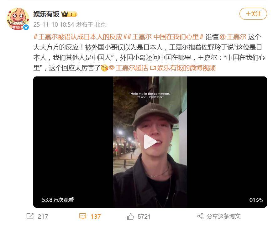 据网友11月10日爆料,事发当时,王嘉尔与他的团队在一起,其中包括日籍舞者佐野玲于。面对误认,王嘉尔没有丝毫不悦,而是立即亲切地搂住佐野玲于的肩膀,从容解释道:“这位是日本人,我们其他人是中国人。”一个简单的搂肩动作,既清晰划清了身份界限,又瞬间传递出团队的友爱与凝聚力,避免了任何可能的对立尴尬。