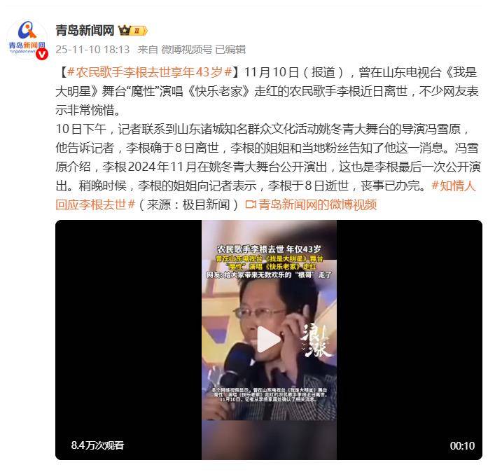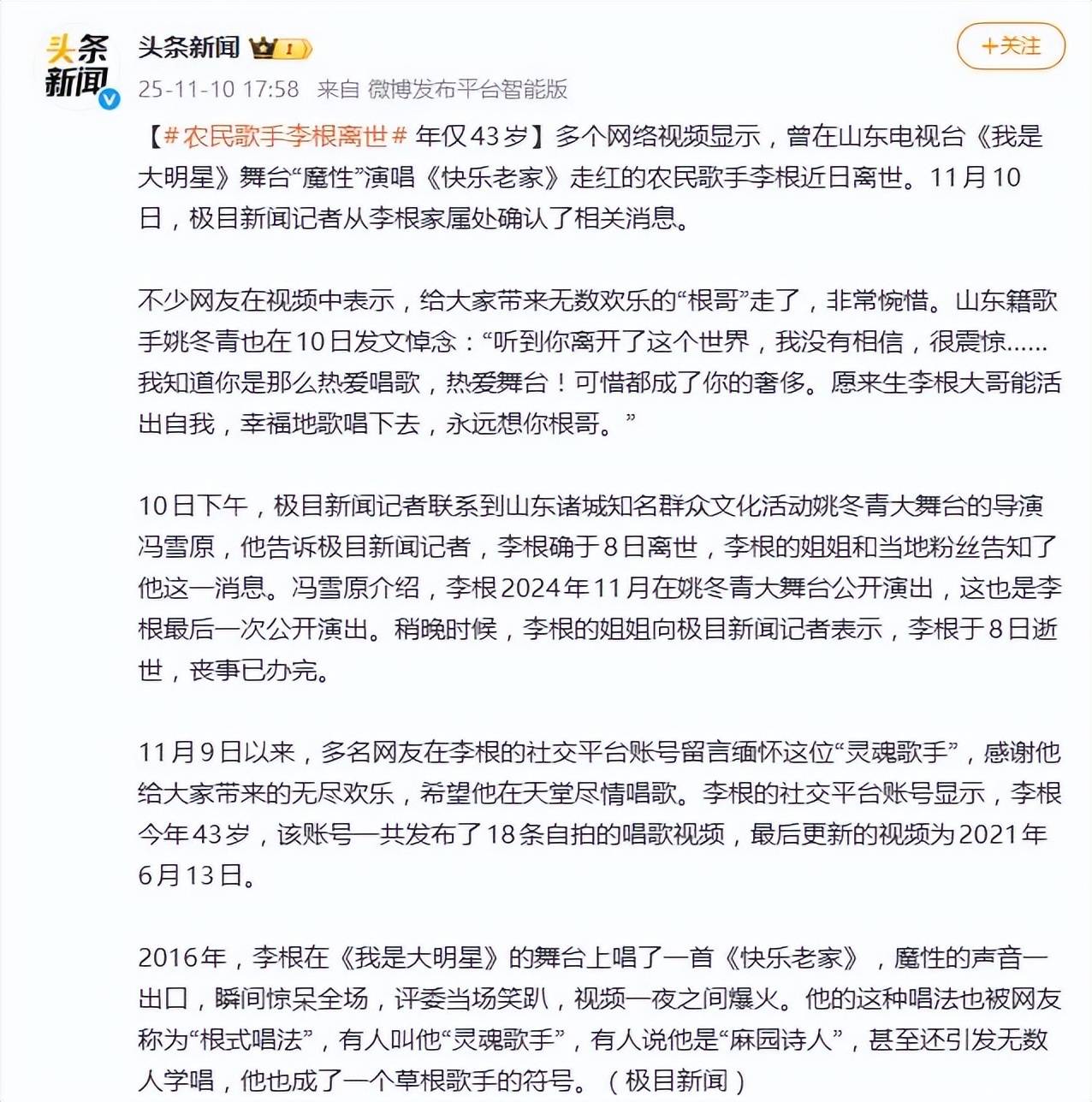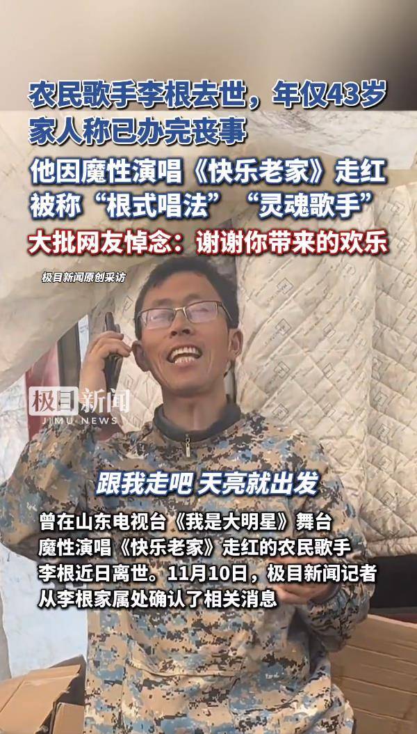 据11月10日报道,农民歌手李根逝世的消息悄然传开,终年43岁。这位曾以一首“根式”《快乐老家》惊艳全网的草根符号,生命戛然而止,引来无数网友集体追忆。