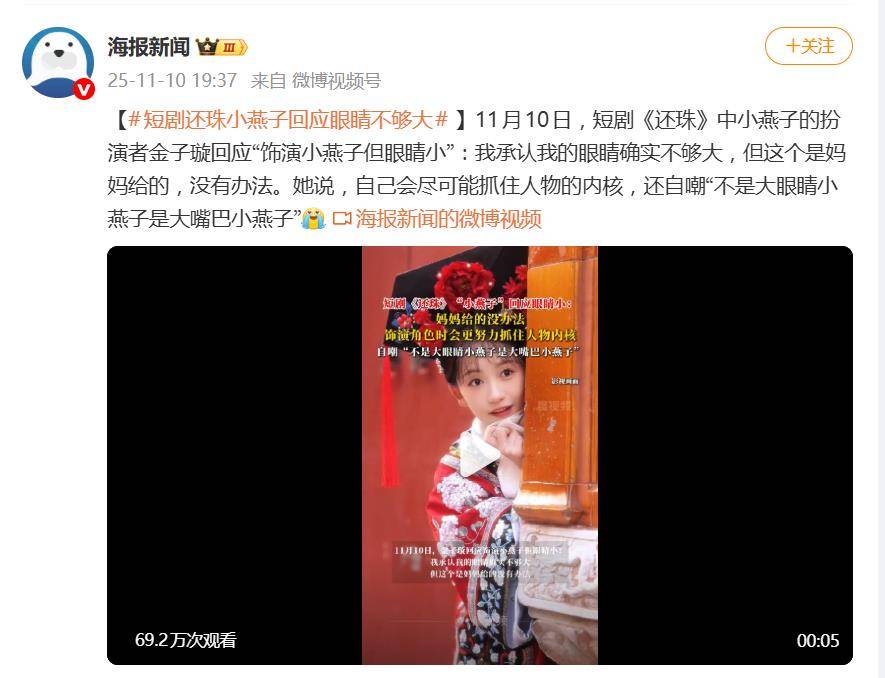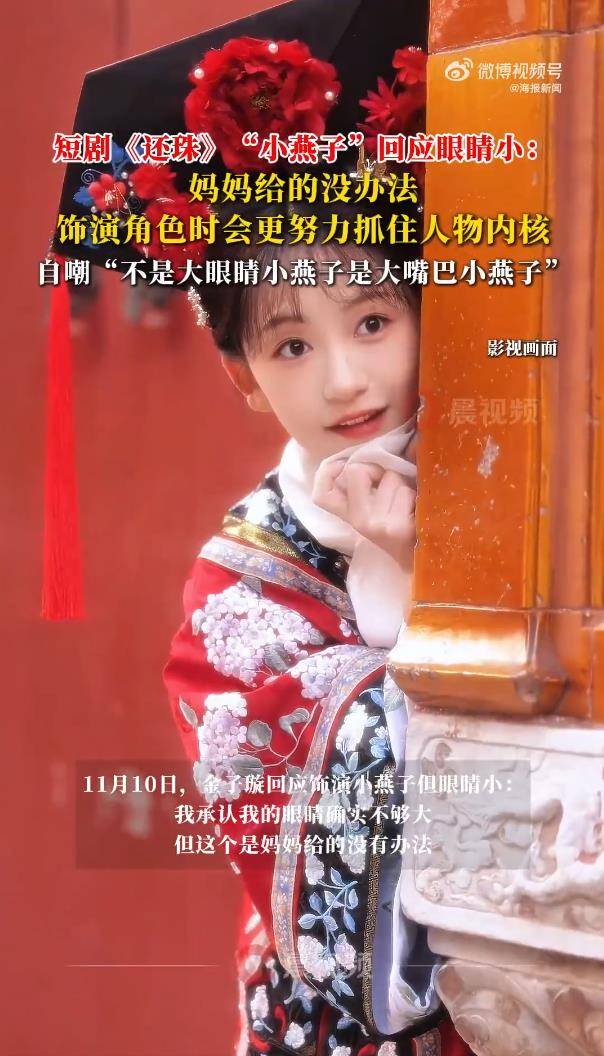 11月10日,短剧《还珠》中饰演小燕子的演员金子璇,因“眼睛不够大”被推上风口浪尖。她在剧组扫楼直播中直面争议,一句“我承认眼睛确实不够大,但这是妈妈给的,无