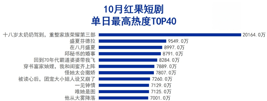 再看免费短剧领域,10月红果短剧总热度达99.28亿,较上期小幅下滑2.6%,这或许因为暑期之后重点项目减少,不仅新剧数量较上期下降22部,热度峰值超8000万的微短剧也仅有5席,较上期减少6席。