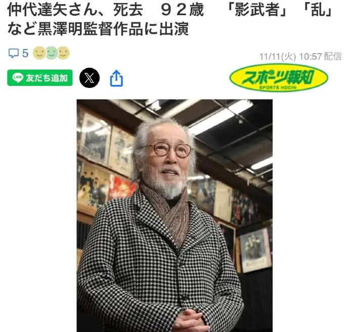 11月11日,据日媒,曾主演电影《人间的条件》及黑泽明导演的《影子武士》等作品,文化勋章获得者仲代达矢去世,享年92岁。据悉,他从影以来出演一百多部作品,曾主演黑泽明导演《影武