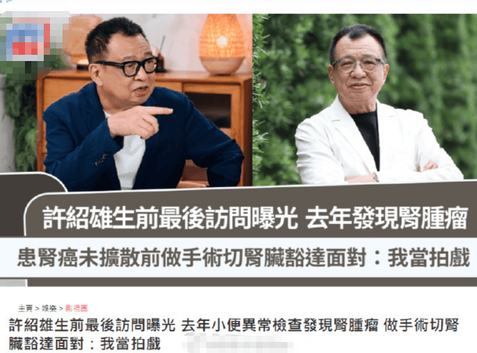 近日,著名艺人许绍雄因癌症致器官衰竭,28日凌晨安详离世。他生前录制的一档节目将在11日播出,节目中他透露自己去年发现肾肿瘤的经历,去年发现小便颜色异常深,起初以为只是“热气”,但两星期过去仍未见改善。在太太的叮嘱下,他进行了详细检查。检查结果令人震惊,医生发现他小便带血,随后的影像检查更显示其中一边肾脏有阴影,最终确诊为肿瘤。庆幸的是,癌细胞当时并未扩散到其他部位,许绍雄遂听从医生建议,接受了肾脏切除手术。