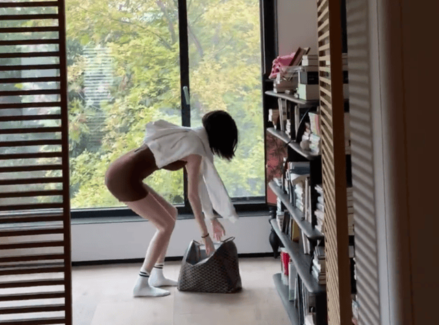 下图中站在书柜前弯腰整理东西的何穗,腹部都不见一丝赘肉,妥妥的辣妈一枚。