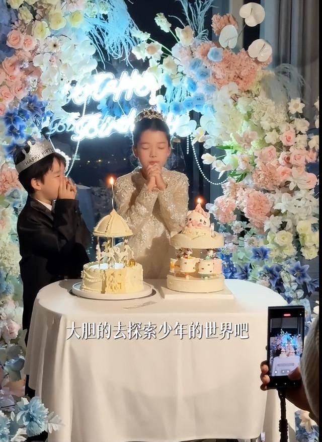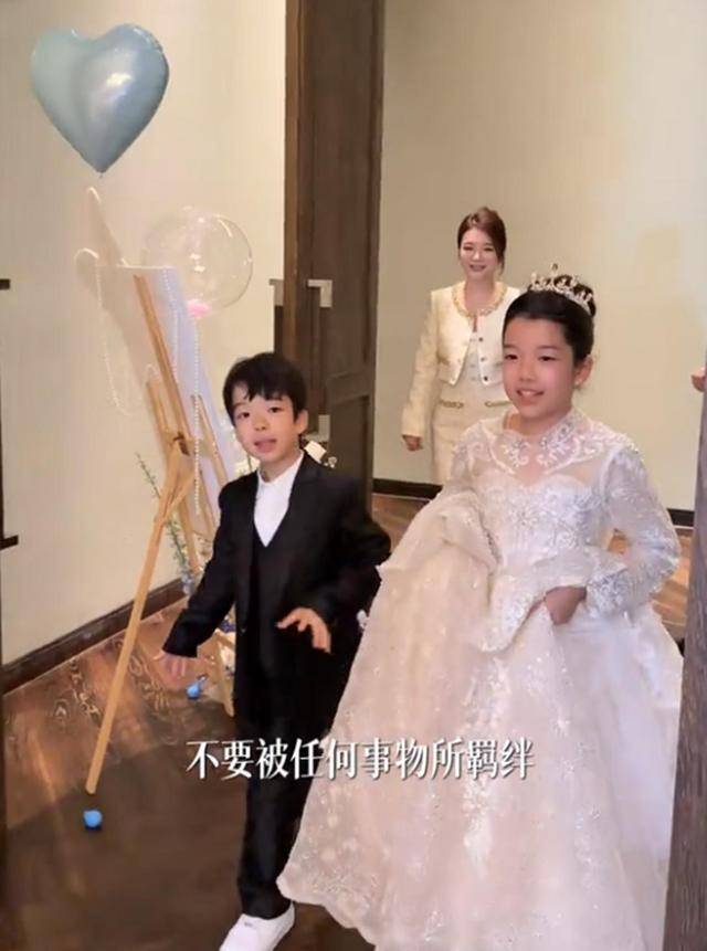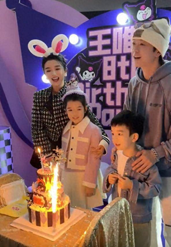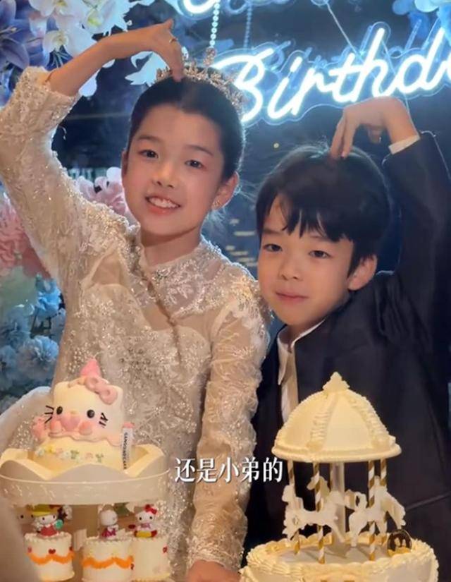王唯伊穿着白色蕾丝裙戴着小皇冠,和穿黑色西装的弟弟站在一起,王栎鑫则罕见地和吴雅婷同框切蛋糕。