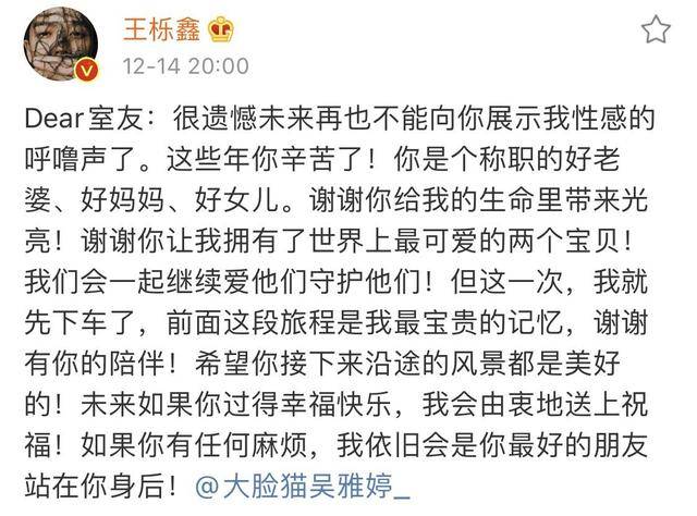 2020年12月王栎鑫一句“我们和平分开”的微博,让#王栎鑫吴雅婷离婚# 话题阅读量破20亿。