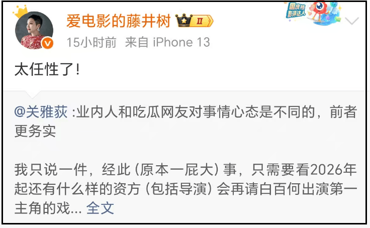 近日,就连续有业内人士发文,称业内和网友的吃瓜心态不同,东京电影节这件事,将会对白百何的事业产生影响。另外一位制片人则直接转发该博文,直言:“太任性了!”