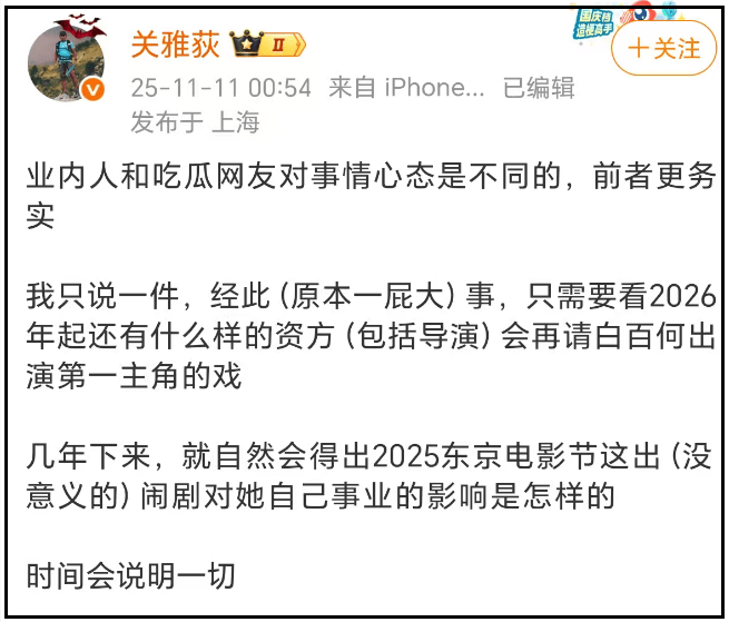 谁能想到,白百何“大闹”东京电影节这件事还有后续!一系列操作翻车后,大家都觉得这件事大结局了,不料白百何好友还在叫嚣,称其“不缺剧本和导演”,马上被业