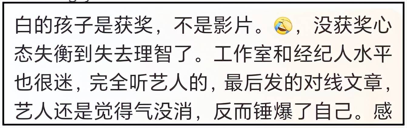 还有人觉得,从这件事就能看出来,白百何的目的性太强了,认为她拍这部电影就是为了冲奖,得知获奖的不是自己,就觉得片方对不起自己,转头就掀桌子。
