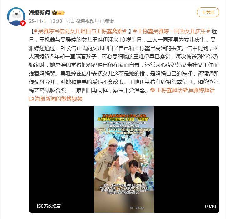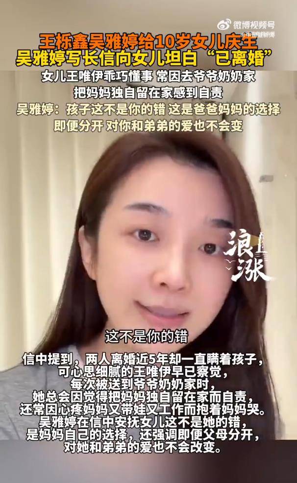 据11月11日报道,王唯伊10岁生日这天,妈妈吴雅婷用一封长信和一段视频,揭开了埋藏近五年的家庭秘密——她与王栎鑫早已离婚。这场迟来的坦白,却因女儿一句“把妈妈独自留在家”的愧疚眼泪,戳中了无数人的心。