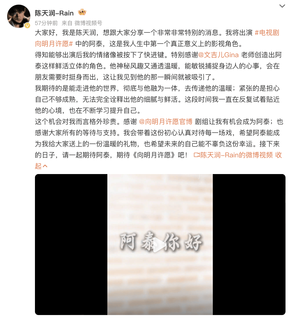 11月12日,时代峰峻旗下艺人陈天润宣布成立工作室,同步开通个人社交账号,认证身份为“演员”,并宣布出演电视剧《向明月许愿》中的角色“阿泰”,这也是其首