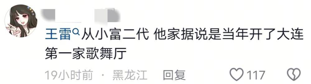 他是实打实的大连富二代, 据说啊, 只是据说, 大连第一家歌舞厅就是王雷家里开的, 这实力就不用多猜了,