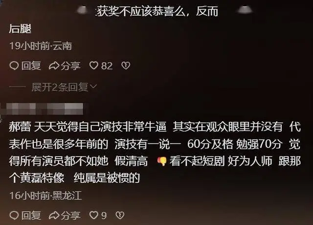 大部分网友认为,郝蕾虽然是实力派,但出道近30年,主要奖项只有2010年的金马奖最佳女配角。
