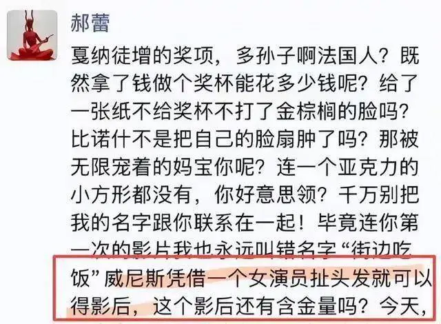 截图中“郝蕾”火力全开,疯狂抨击辛芷蕾,核心意思就一个,威尼斯影后辛芷蕾不配拿这个奖。