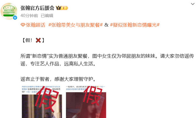 近日,张翰被拍到带新美女跟朋友聚会,结束后两人一起离开,引发新恋情传闻。对此,张翰官方后援会回应:“所谓‘新恋情’实为普通朋友聚餐,图中女生仅为邻居朋友的