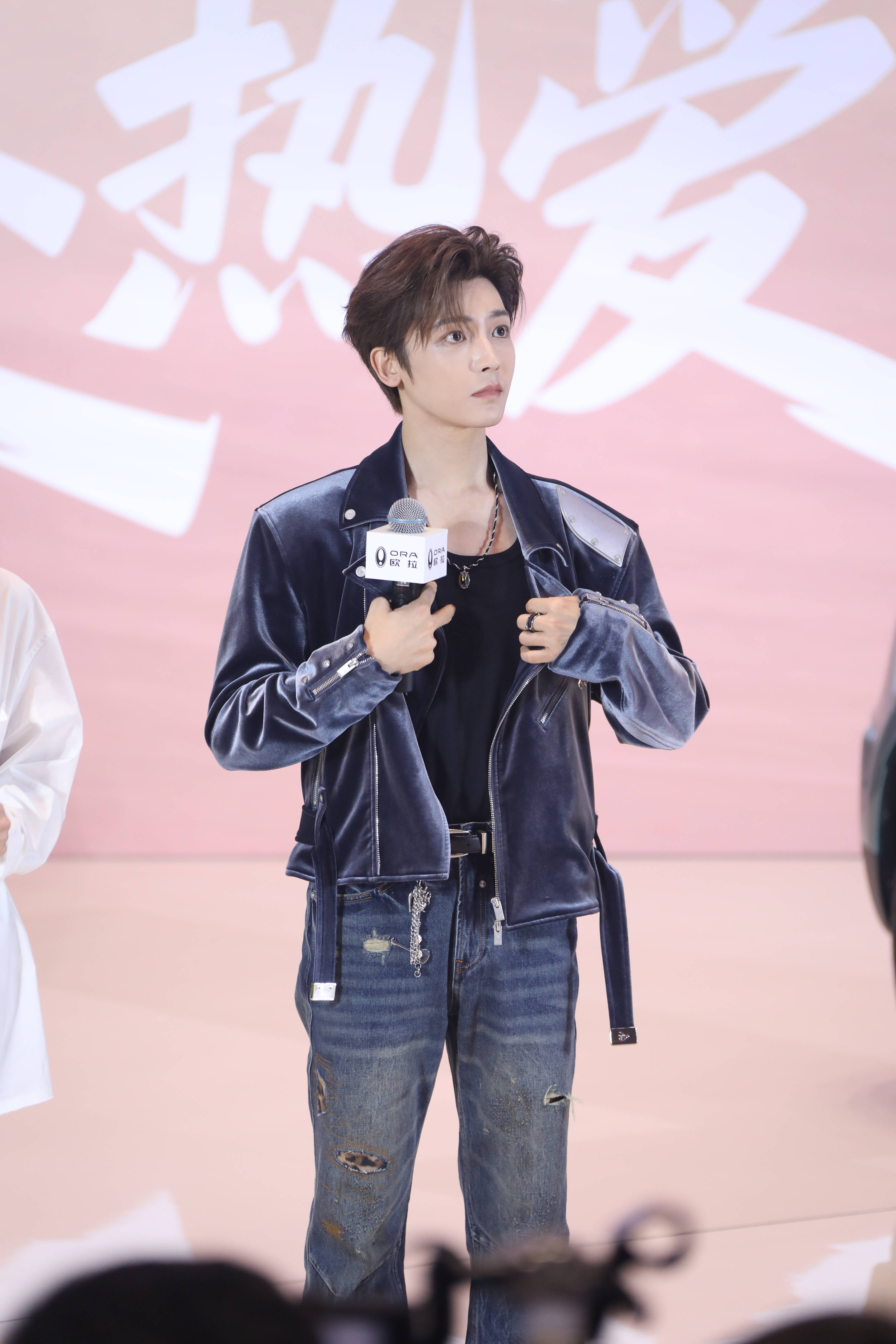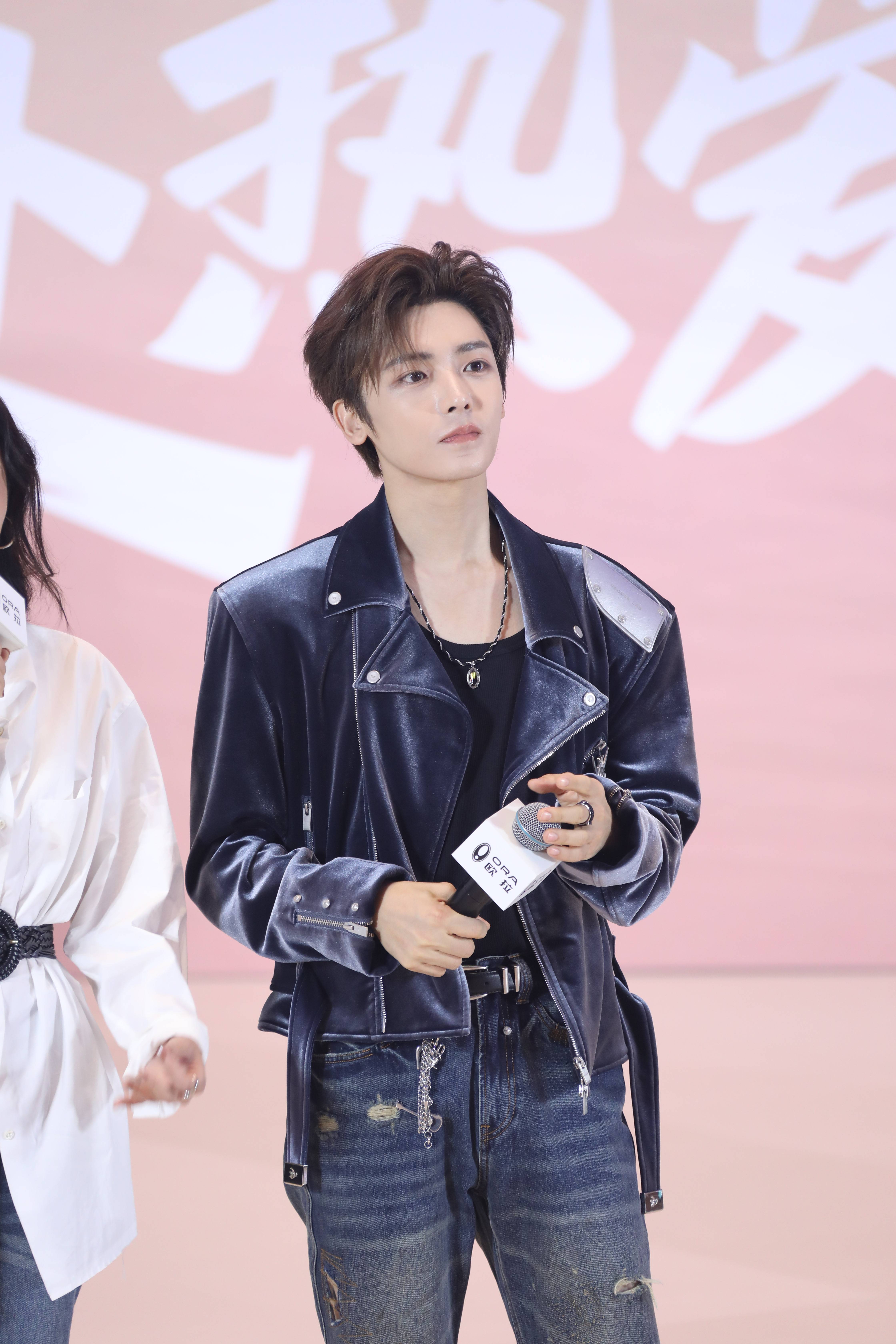 11月12日,侯明昊身着深蓝丝绒机车夹克配破洞牛仔裤亮相某品牌活动,酷帅惹眼。