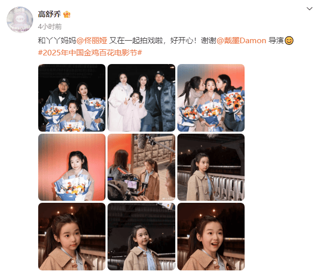 12日,董璇女儿小酒窝(高舒乔)在社交平台上发文回应与佟丽娅一起出演金鸡奖开幕式短片,她表示:“和丫丫妈妈(佟丽娅)又在一起拍戏啦,好开心!谢谢戴墨导演。”据悉,11月11日,2