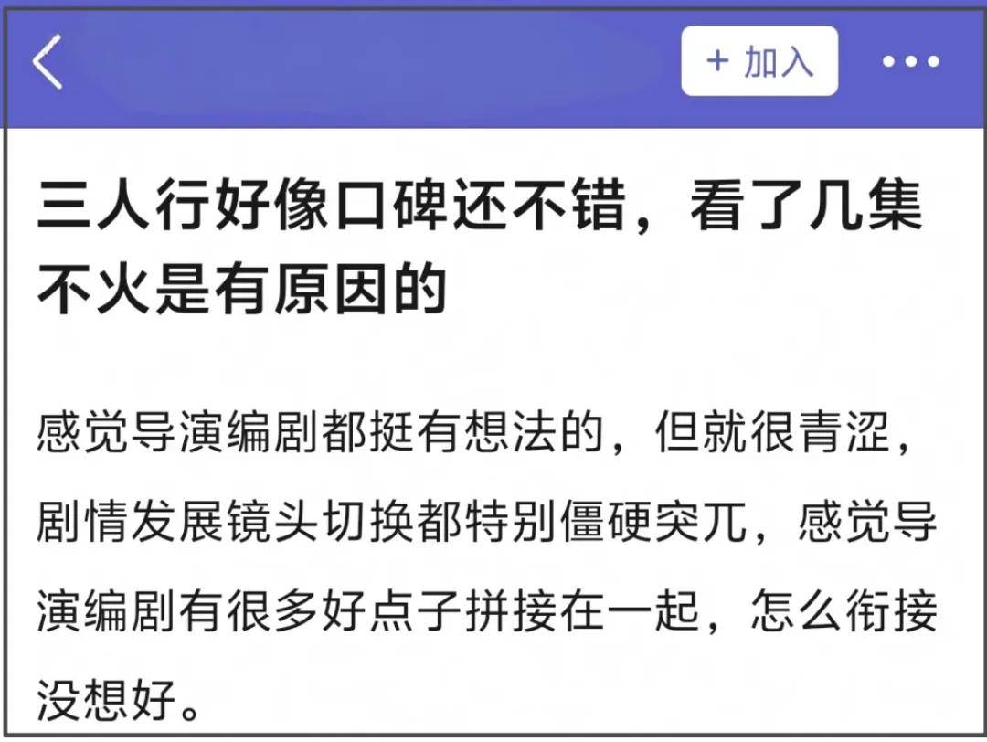 播出不到半个月时间,《三人行》已经积累了不少剧粉,虽然剧集热度一般,但如今长剧能吸引到“自来水”讨论剧情,还是挺不容易的。