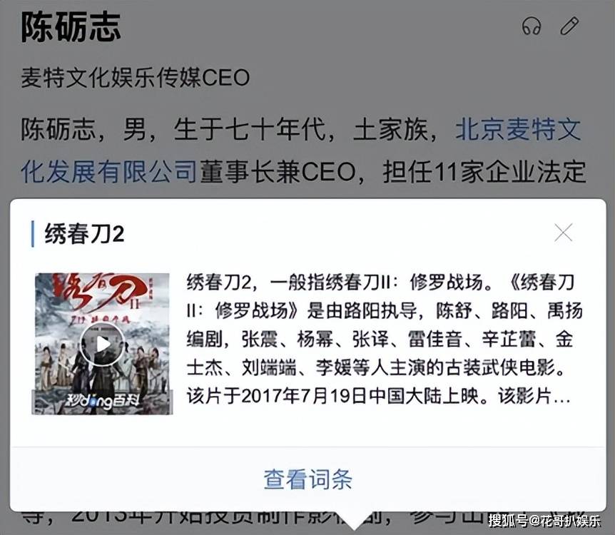 更可笑的是,陈砺志还说自己“不认识辛芷蕾”,可辛芷蕾参演的《绣春刀2》就是他公司的电影,百度百科在那摆着,不能说百度胡说吧。