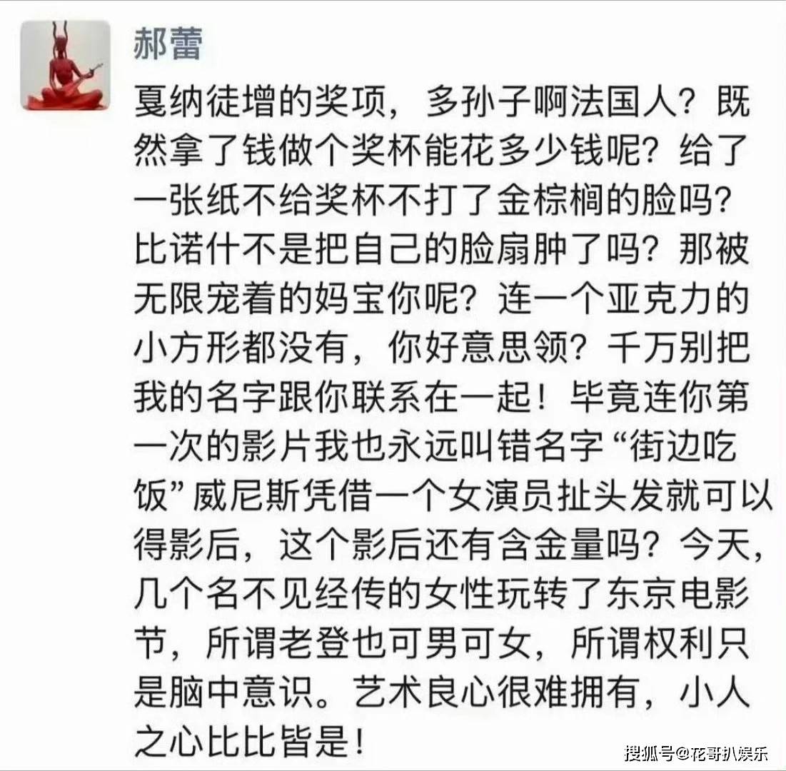 网友们纷纷猜测,郝蕾是不是因为自己出资又出演的电影,连东京国际电影节的普通入围都没捞着,才破防成这样?