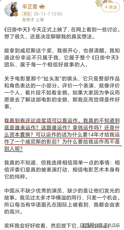 被众人cue到的辛芷蕾,自然也坐不住了,赶紧发了篇微博回应。这篇回应堪称公关文范本,回应得有理有据,可她偏要画蛇添足,说自己不知道什么叫“运作”,能拿威尼斯影后全靠自己的表演打动了所有评委。