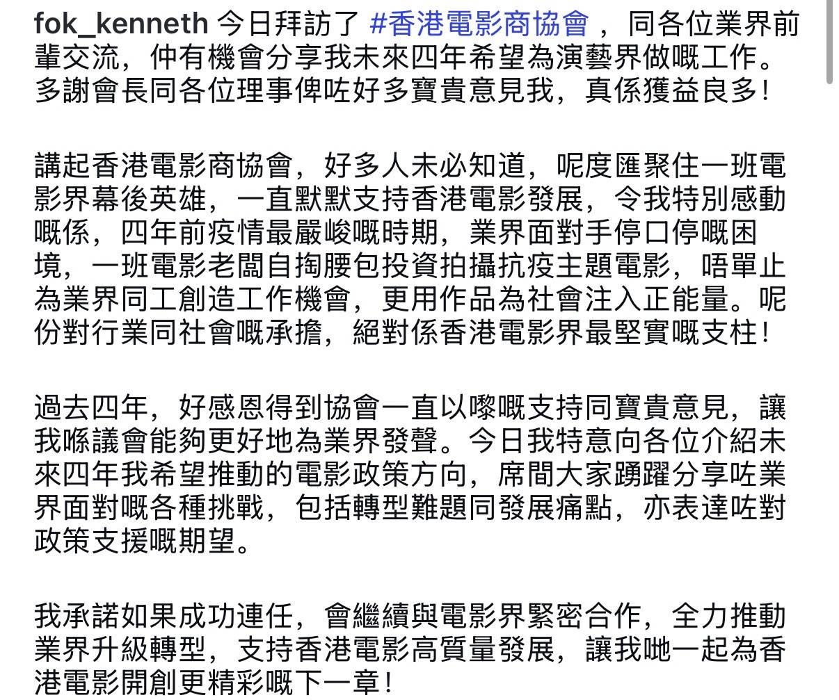 怎么说呢,霍启刚与林建岳此次碰面在身份上,一个是议员,一个是电影商协会的主席,在关系上存在互惠互利。霍启刚是议员,要连任需要相关协会的支持,他才会接连去拜访不同的协会。而林建岳所在的电影商协会也需要议员的支持,向政府争取更多的资金、资源来支持业内的发展。所以霍启刚在拜访了协会之后,对外公开做出承诺,若是连任会继续与电影界密切合作,推动转型,支持香港电影高质量发展。